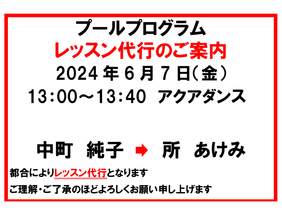 HPをご覧いただき、誠にありがとうございます。 2024年6月7日(金)プールプログラム代行案内です。 急な変更となり申し訳ございません。 ご理解のほど、お願いいたします。