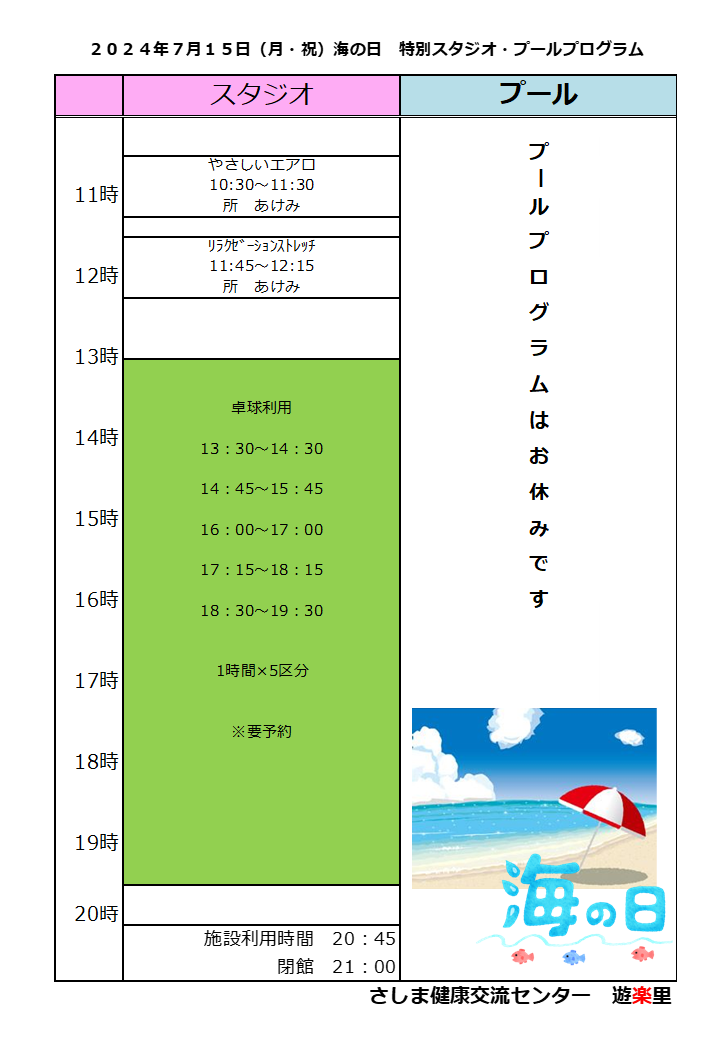 7月15日(月) 海の日スタジオプログラムになります。 変更になっているプログラムがございますので、ご確認のうえご参加ください。