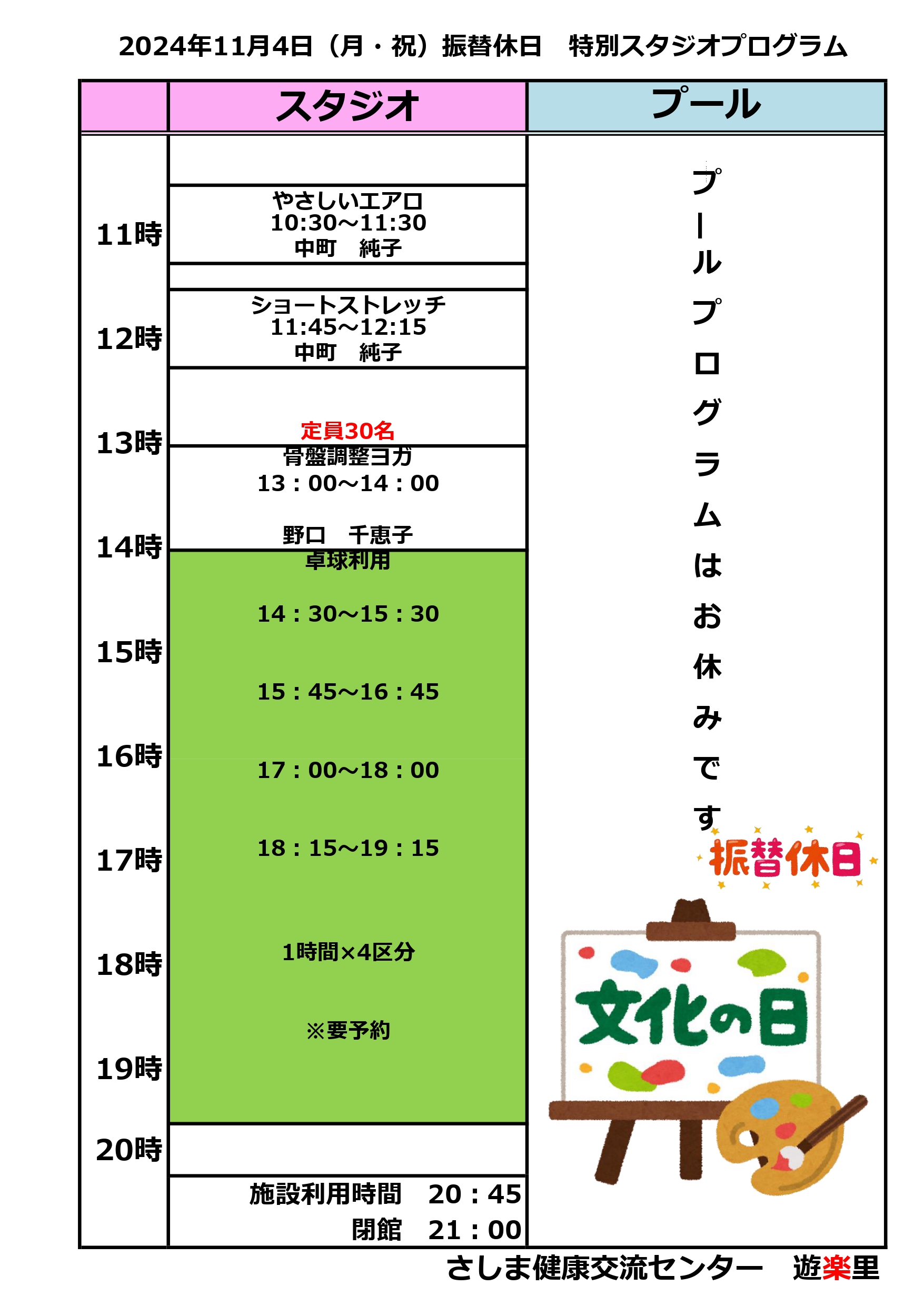 11月4日(月)振替休日のスタジオプログラムになります。 変更になっているプログラムがございますので、ご確認のうえご参加ください。