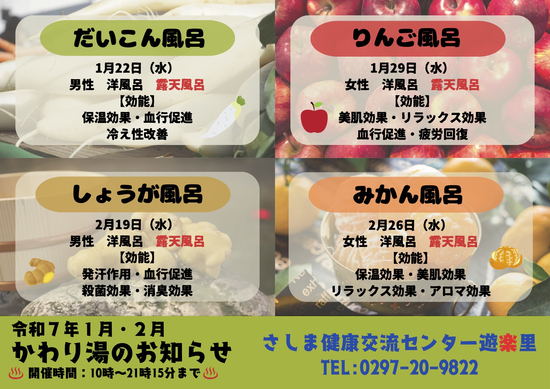 こんにちは! さしま健康交流センター遊楽里です! 本日は1月・2月に開催のかわり湯をご紹介させていただきます! 1月は22日(水)に男性側洋風風呂で【だいこん風呂】を29日(水)に女性側洋風風呂で【りんご風呂】を開催します! どちらのお風呂も身体の芯からポカポカになれます! ぜひこの機会にお試しください! みなさまのご来館を心よりお待ちしております!