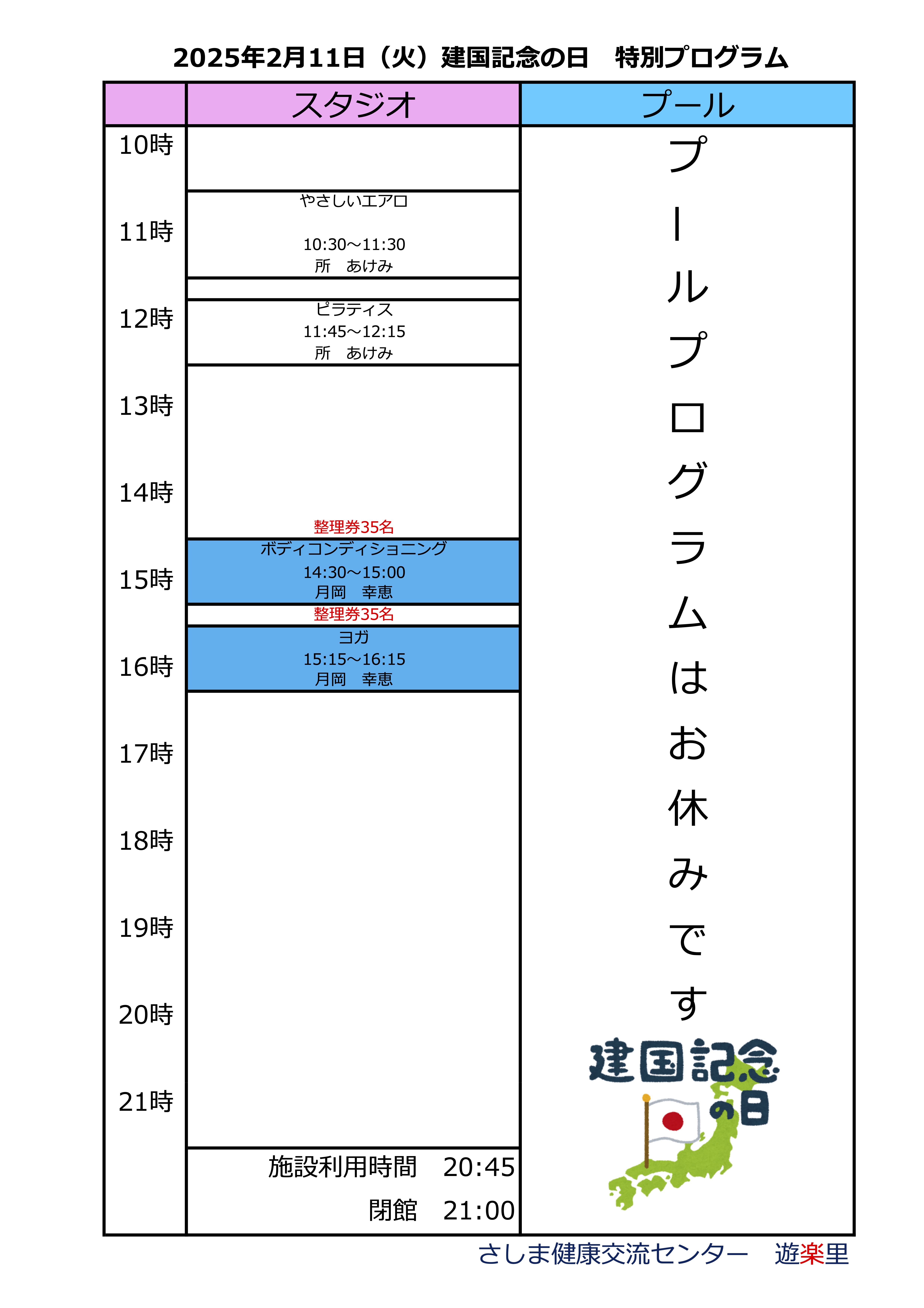 2月11日(火)建国記念の日のスタジオプログラムになります。 変更になっているプログラムがございますので、ご確認のうえご参加ください。