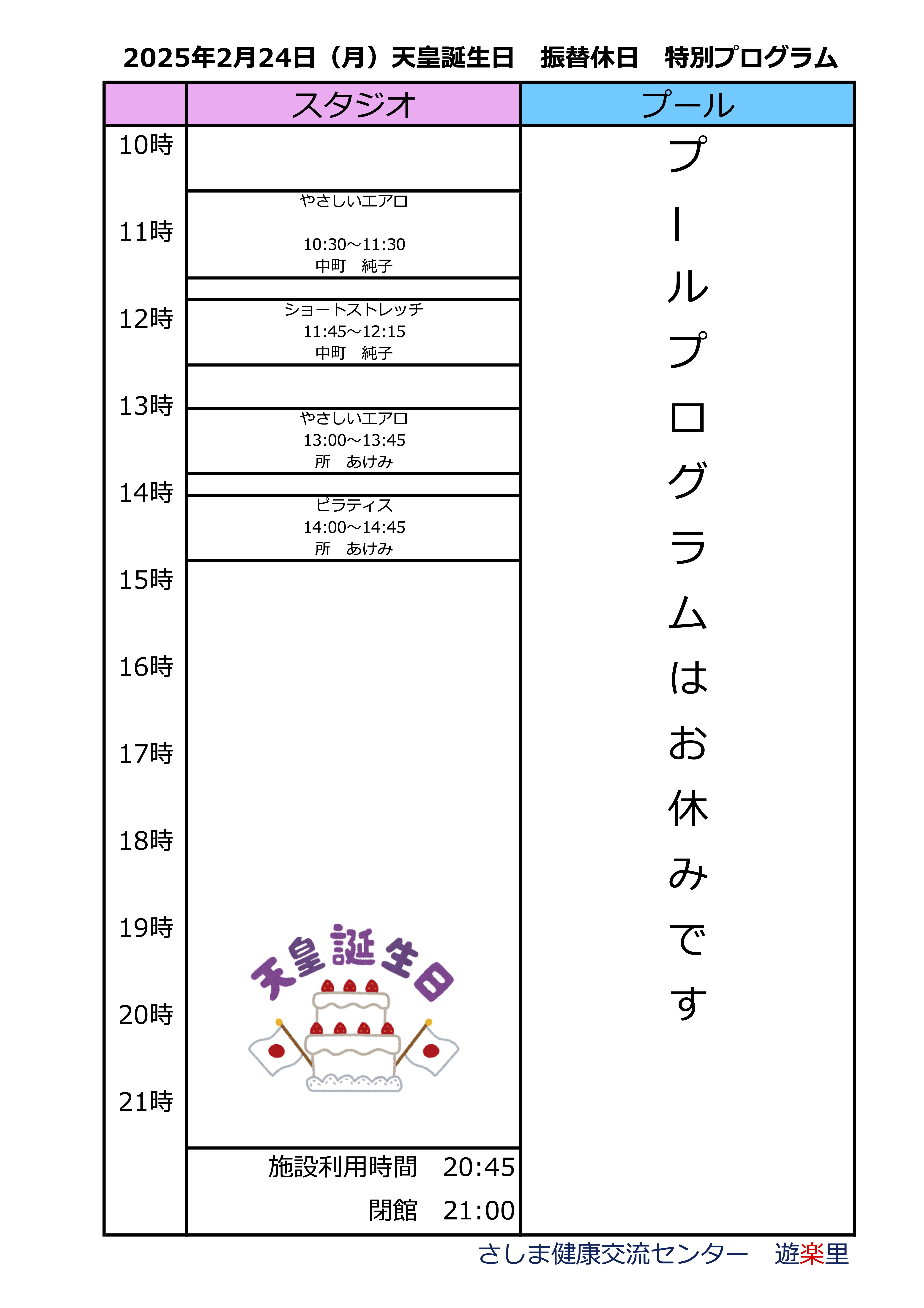 2月24日(月)天皇誕生日 振替休日 スタジオプログラムになります。 変更になっているプログラムがございますので、ご確認のうえご参加ください。
