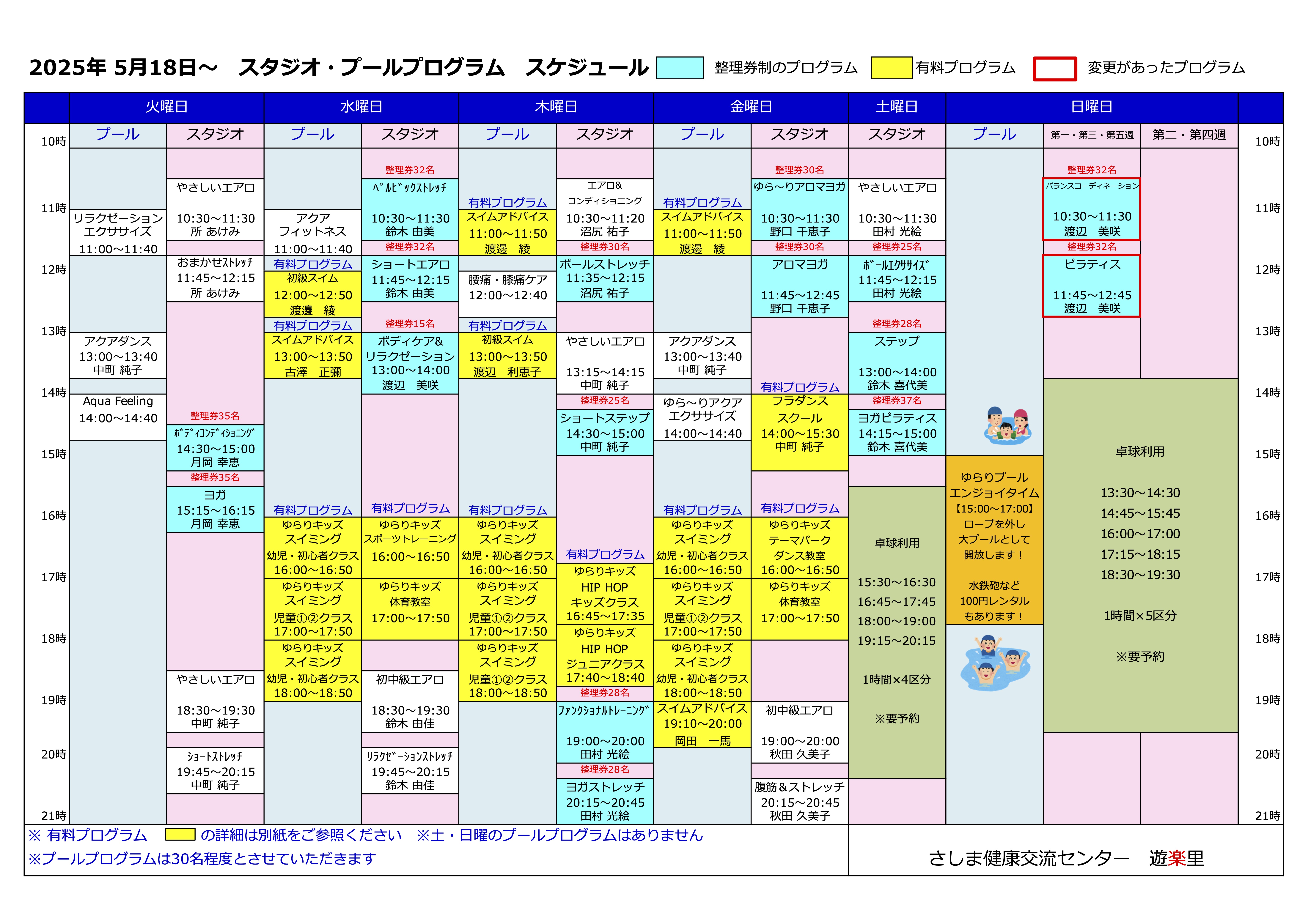 2025年5月18日(日)からのスタジオ・プールプログラムのご案内です。 変更になっているプログラムがございます。 ご確認のうえ、ご参加ください。