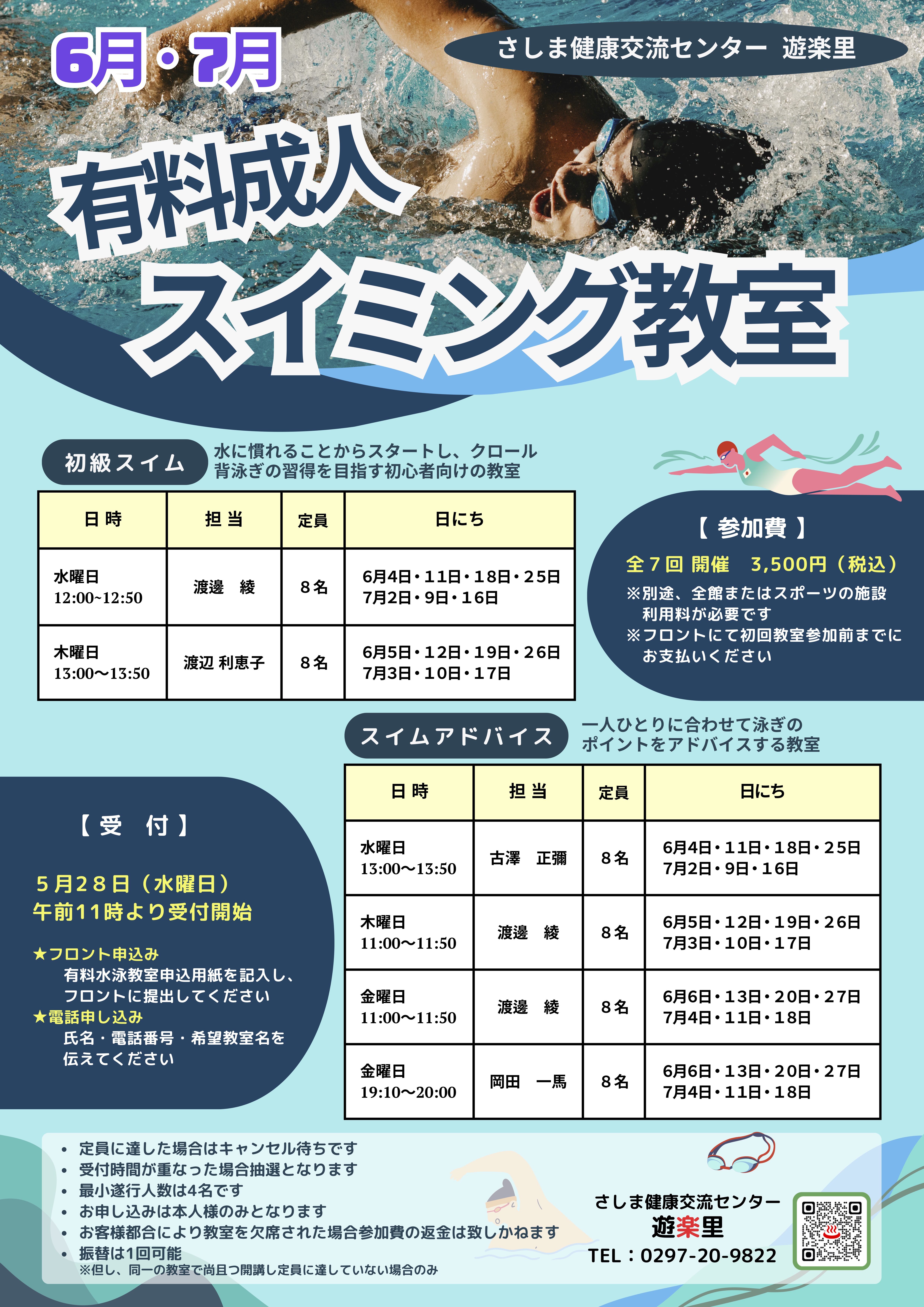 みなさんこんにちは! さしま健康交流センター遊楽里です! 6月・7月有料成人スイミング教室のスケジュールが決まりましたのでご案内させていただきます! 5月28日(水)11:00より受付開始となります! 事前にプール掲示板・フロントにて申し込み用紙をお配りさせていただいておりますのでそちらにご記入いただき、受付時にフロントにご提出ください。 皆様のご参加を心よりお待ちしております!