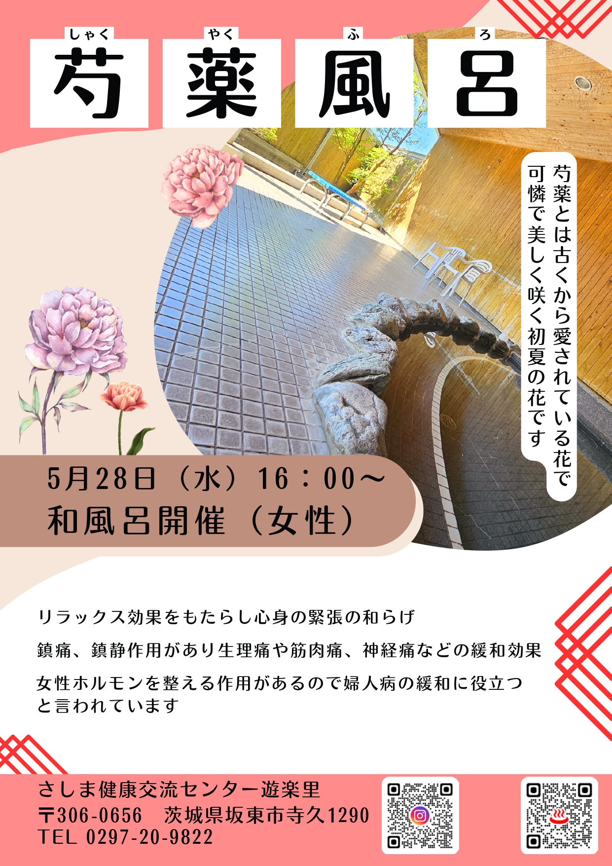 こんにちは! さしま健康交流センター遊楽里です 5月28日(水)16:00〜 芍薬風呂を【女性側和風呂】で開催します! 5〜6月に見頃を迎える美しいお花「芍薬(しゃくやく)」を使った季節限定の変わり湯 ふわっと香る華やかな香りに包まれて、リラックス効果・美肌・血行促進など、うれしい効能もたくさん期待できます みなさまのお越しをお待ちしてます〜! ぜひ癒されに来てくださいね