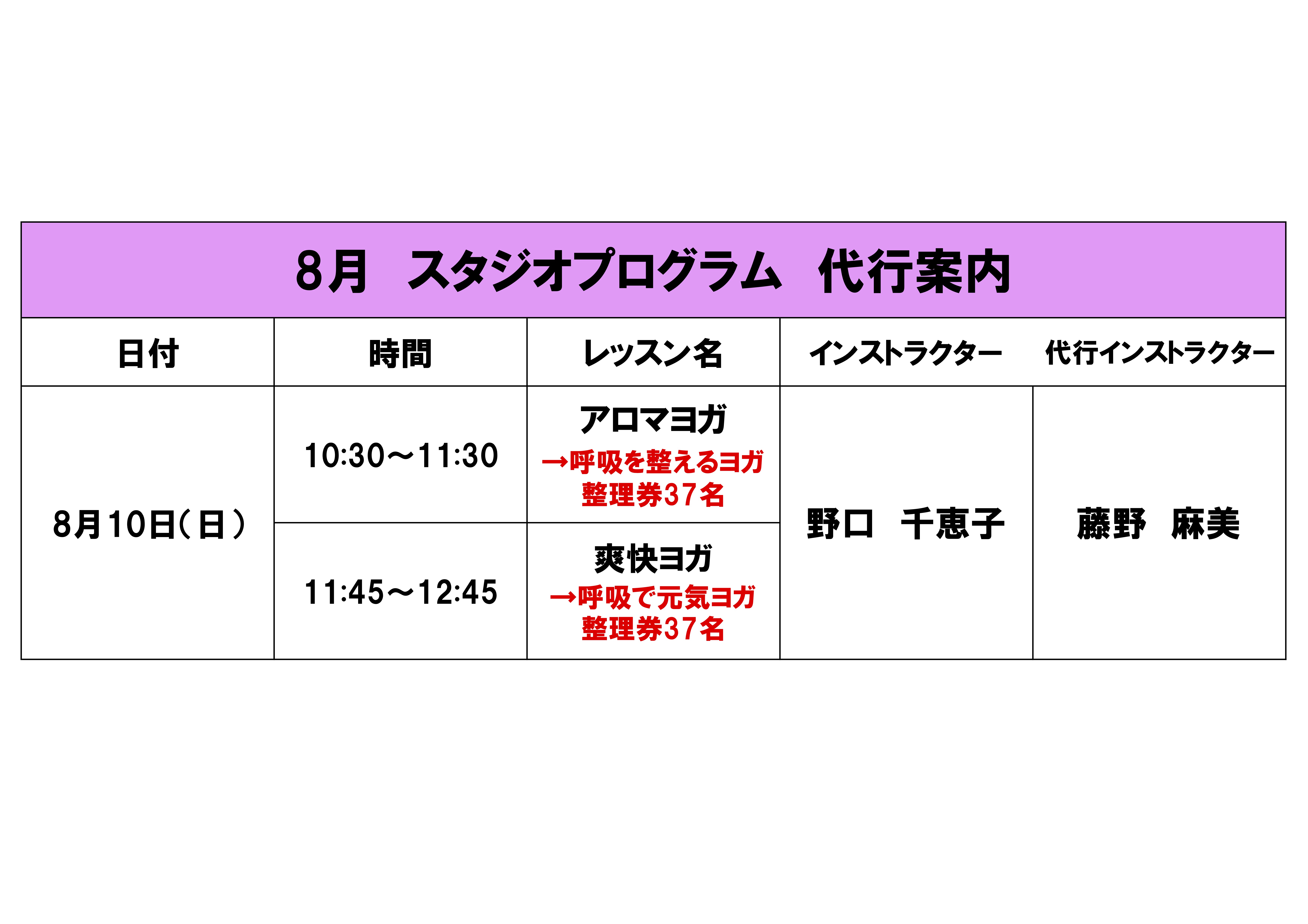 いつも当施設をご利用いただき、誠にありがとうございます。 8月10日(日)に開講予定の下記スタジオプログラムは講師の都合によりレッスン代行となります。 【代行】 ■8月10日(日) 10:30〜11:30 アロマヨガ →呼吸を整えるヨガ(整理券37名) 11:45〜12:45 爽快ヨガ →呼吸で元気ヨガ(整理券37名) 野口千恵子 → 藤野麻美