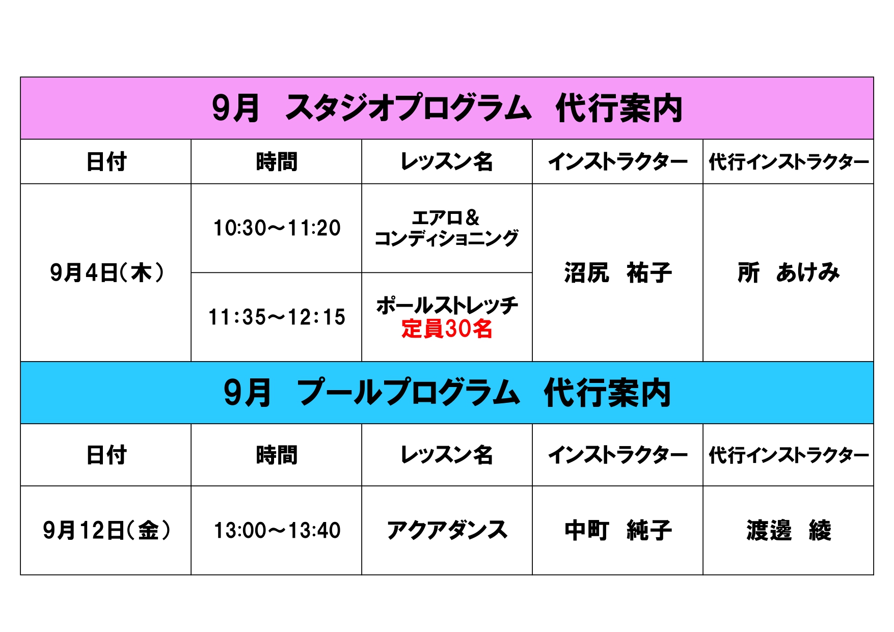 いつも当施設をご利用いただきありがとうございます。 9月のスタジオ・プールプログラムの代行についてご案内をいたします。 スタジオプログラム 代行 9月4日(木) 10:30~11:20 エアロ&コンディショニング 11:35~12:15 ポールストレッチ 沼尻祐子 → 所あけみ プールプログラム 代行 9月12日(金) 13:00~13:40 アクアダンス 中町純子 → 渡邊綾