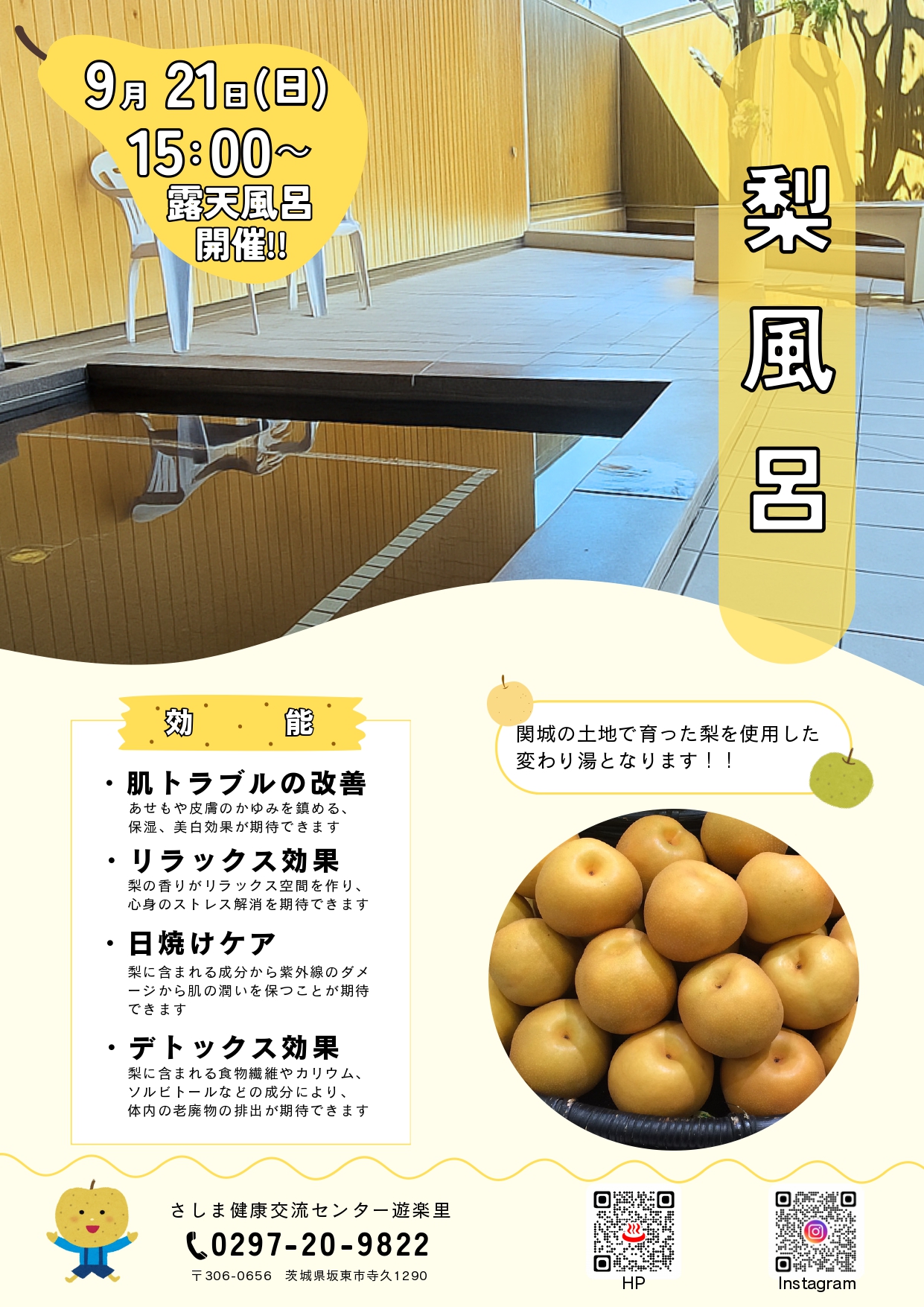 こんにちは! さしま健康交流センター遊楽里です! 9月21日(日)15:00~ 梨風呂を【露天風呂】で開催します! 9月が旬の梨を使用した変わり湯となっています! 梨のほのかな香りに癒されながら夏の日差しでダメージを受けた肌のケアする効果が期待できます! ぜひ梨風呂を体験しに来てくださいね! 皆様のお越しをお待ちしております~!!