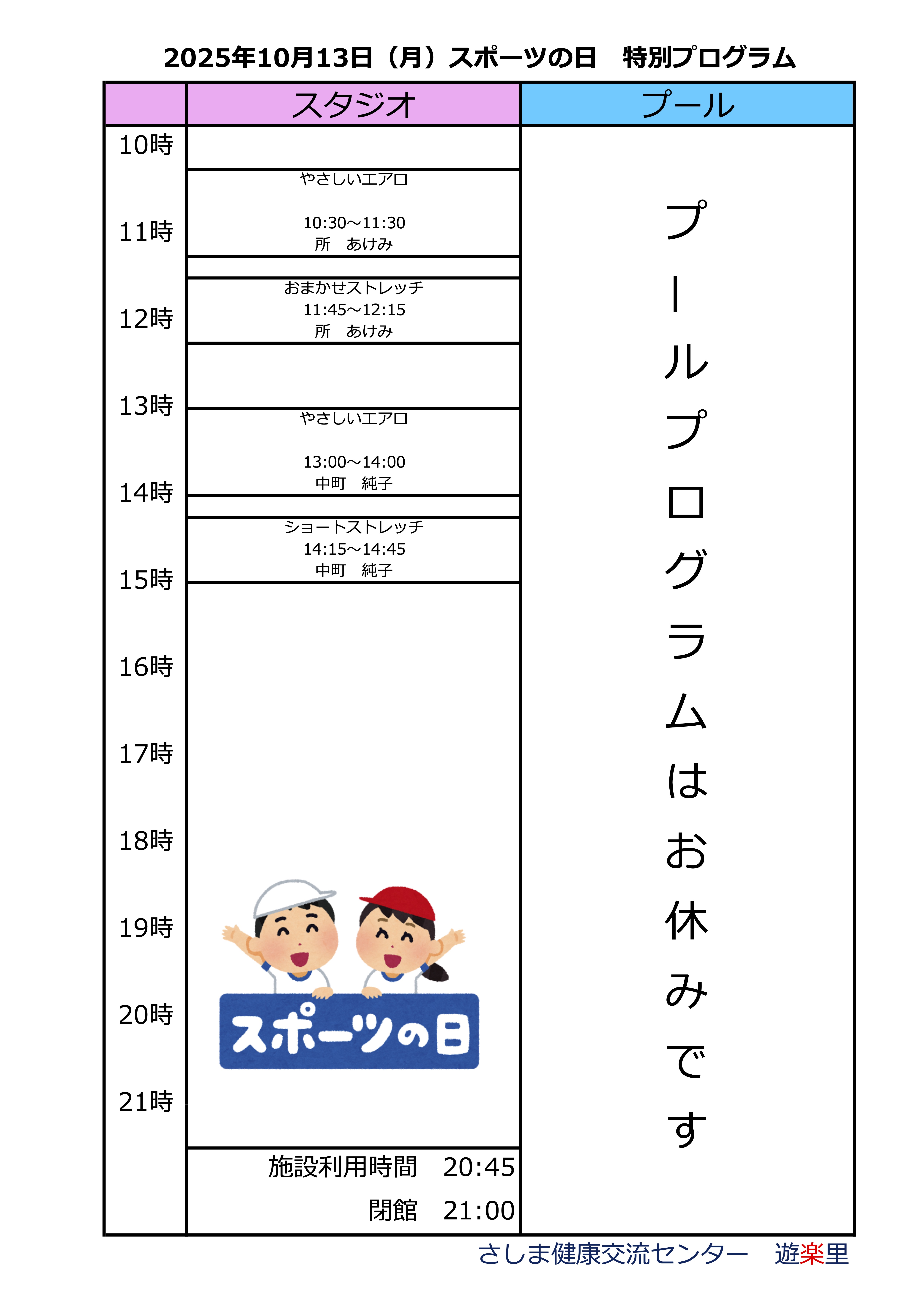 2025年10月13日(月)スポーツの日の特別プログラムとなります。 変更になっているプログラムがございますので、ご確認のうえご参加ください。