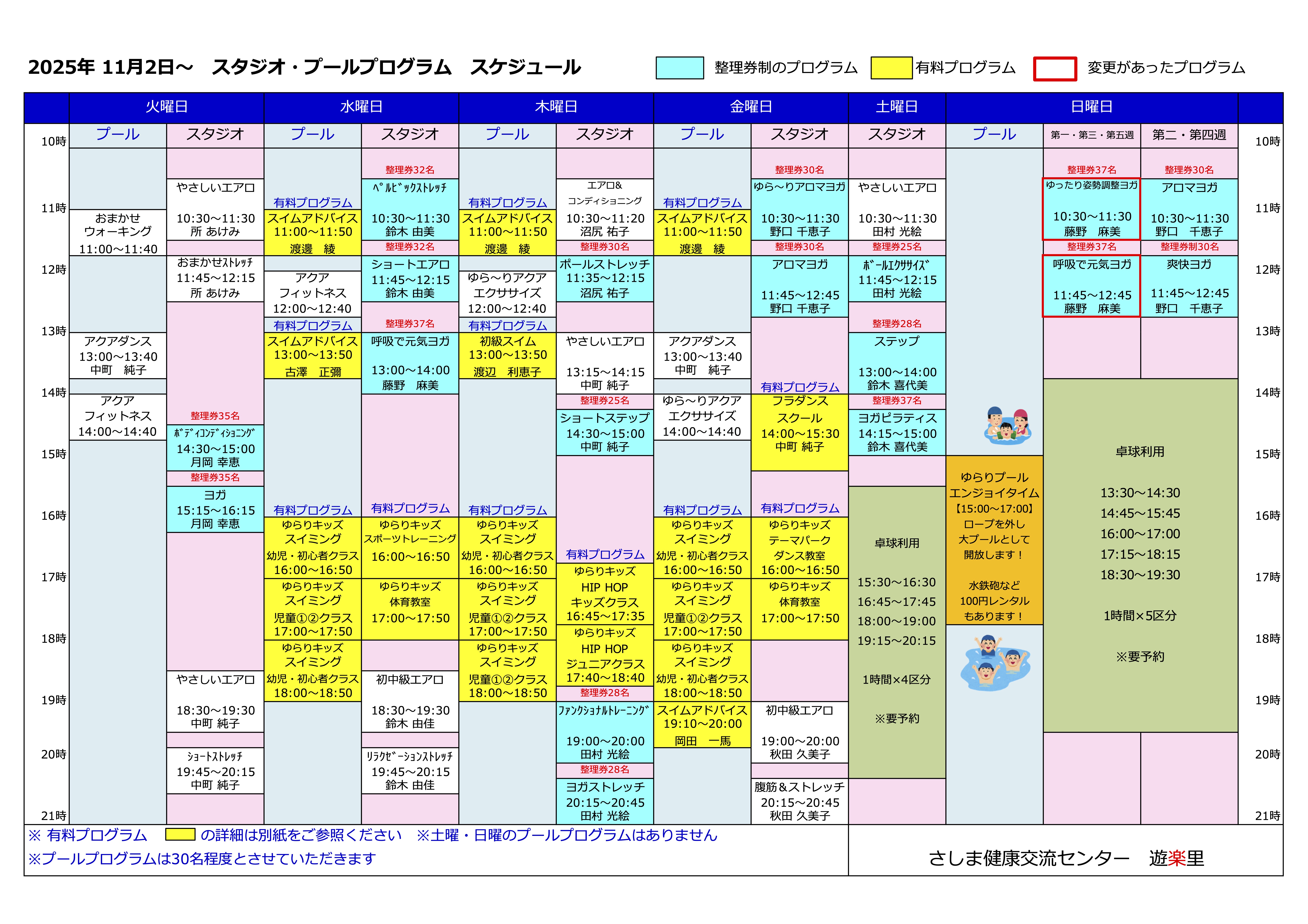 2025年11月2日(日)〜からのスタジオ・プールプログラムのご案内です。 変更になっているプログラムがございます。 ご確認のうえ、ご参加ください。