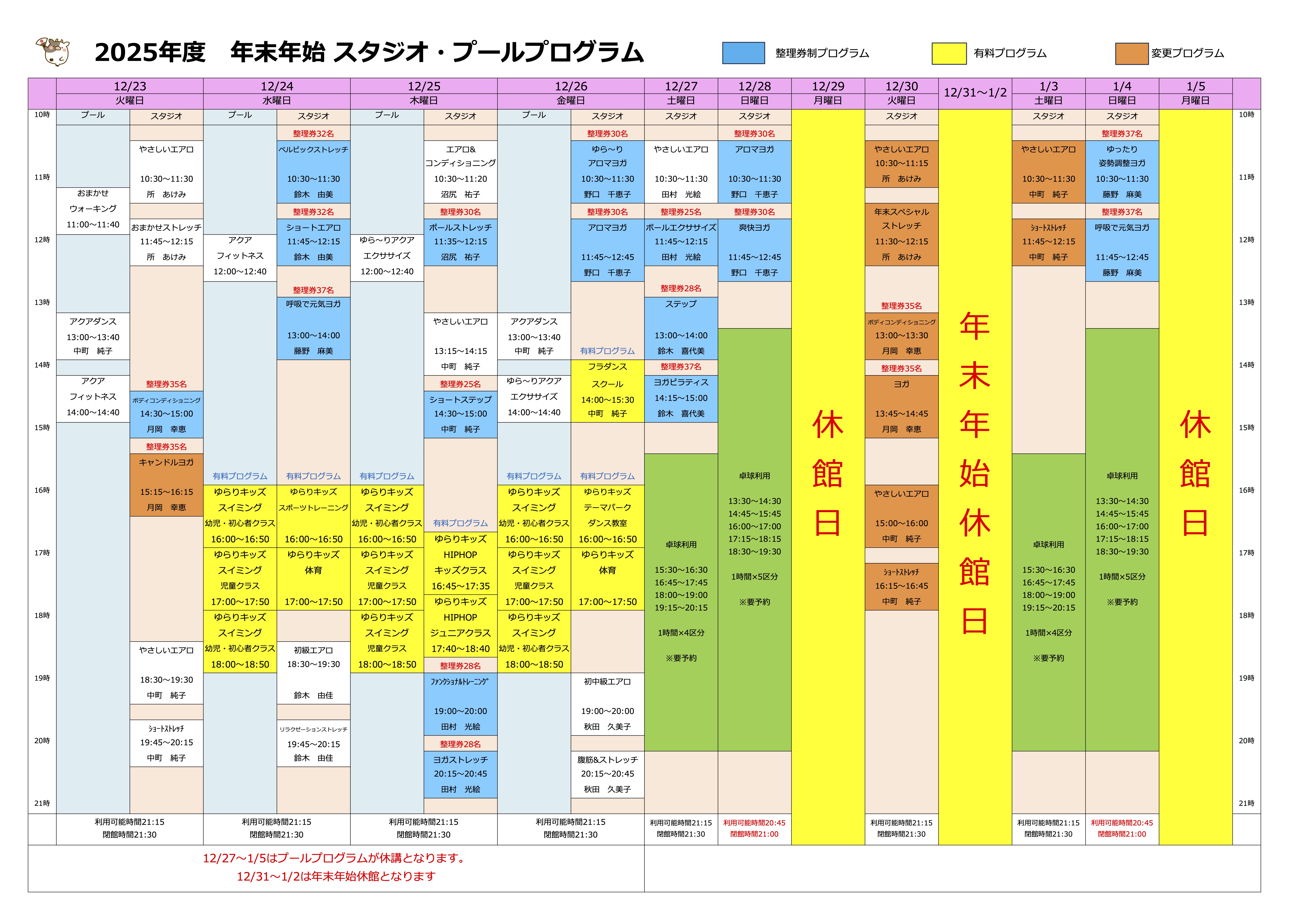 いつも、さしま健康交流センター遊楽里をご利用いただき、誠にありがとうございます。 年末年始期間のスタジオスケジュールになります。 通常とは異なる特別プログラム・時間変更等ございますので、ご利用前に必ずご確認ください。 ご不明な点がございましたら、フロントまでお気軽にお問い合わせください。 皆さまのご来館を心よりお待ちしております。