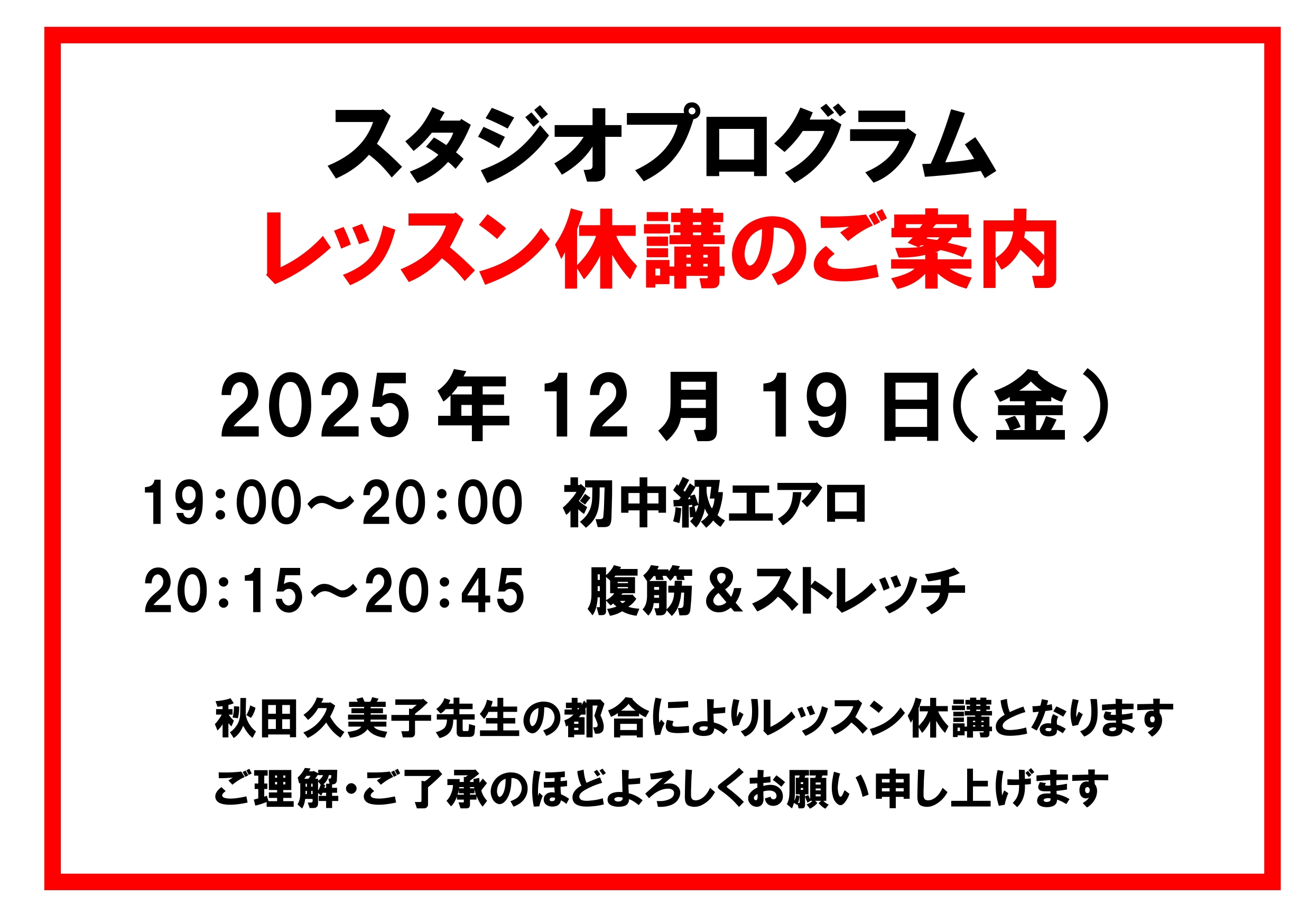 12月19日(金)スタジオプログラム休講案内