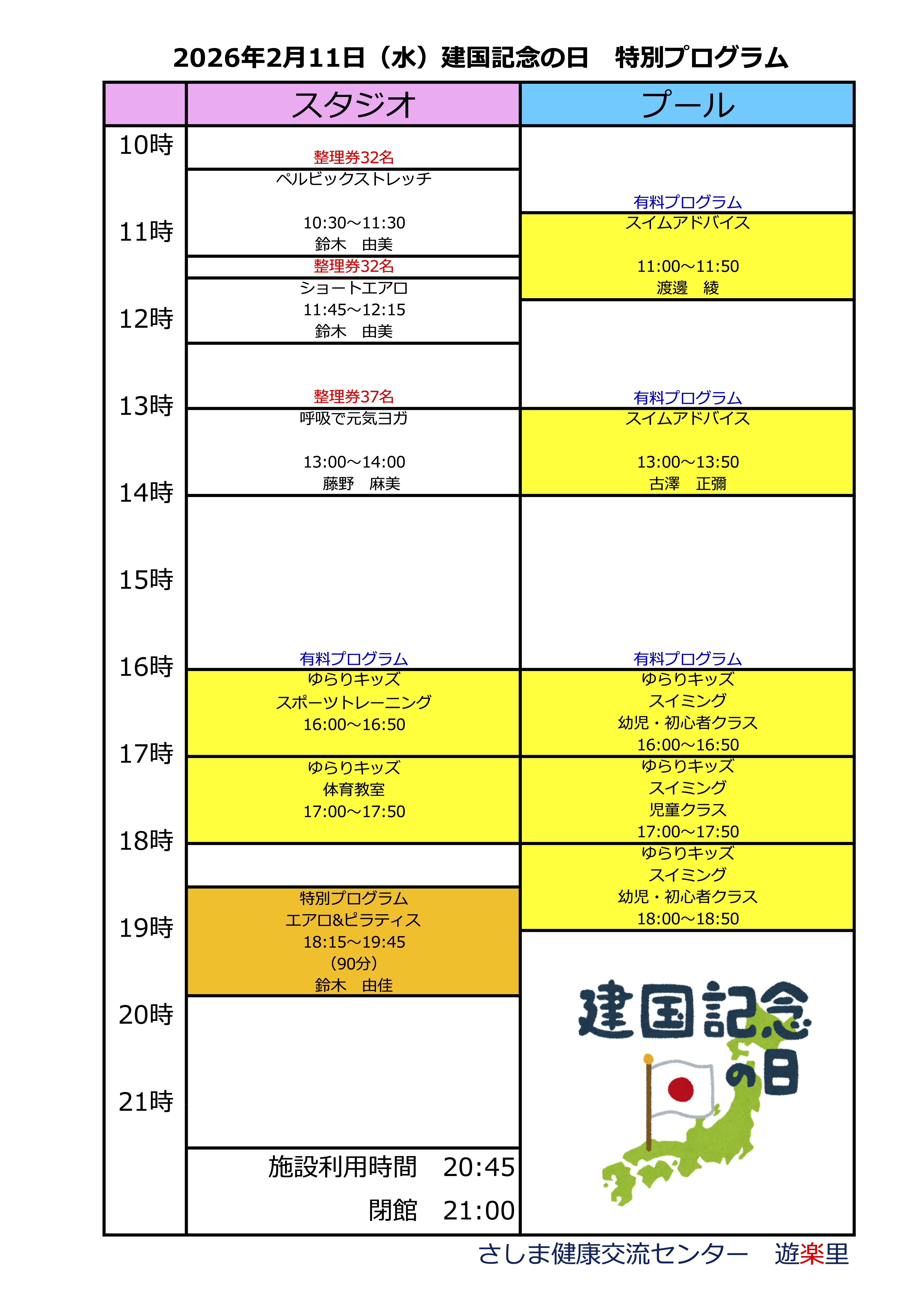 2026年2月11日(水)建国記念の日の特別プログラムとなります。 変更になっているプログラムがございますので、ご確認のうえご参加ください。