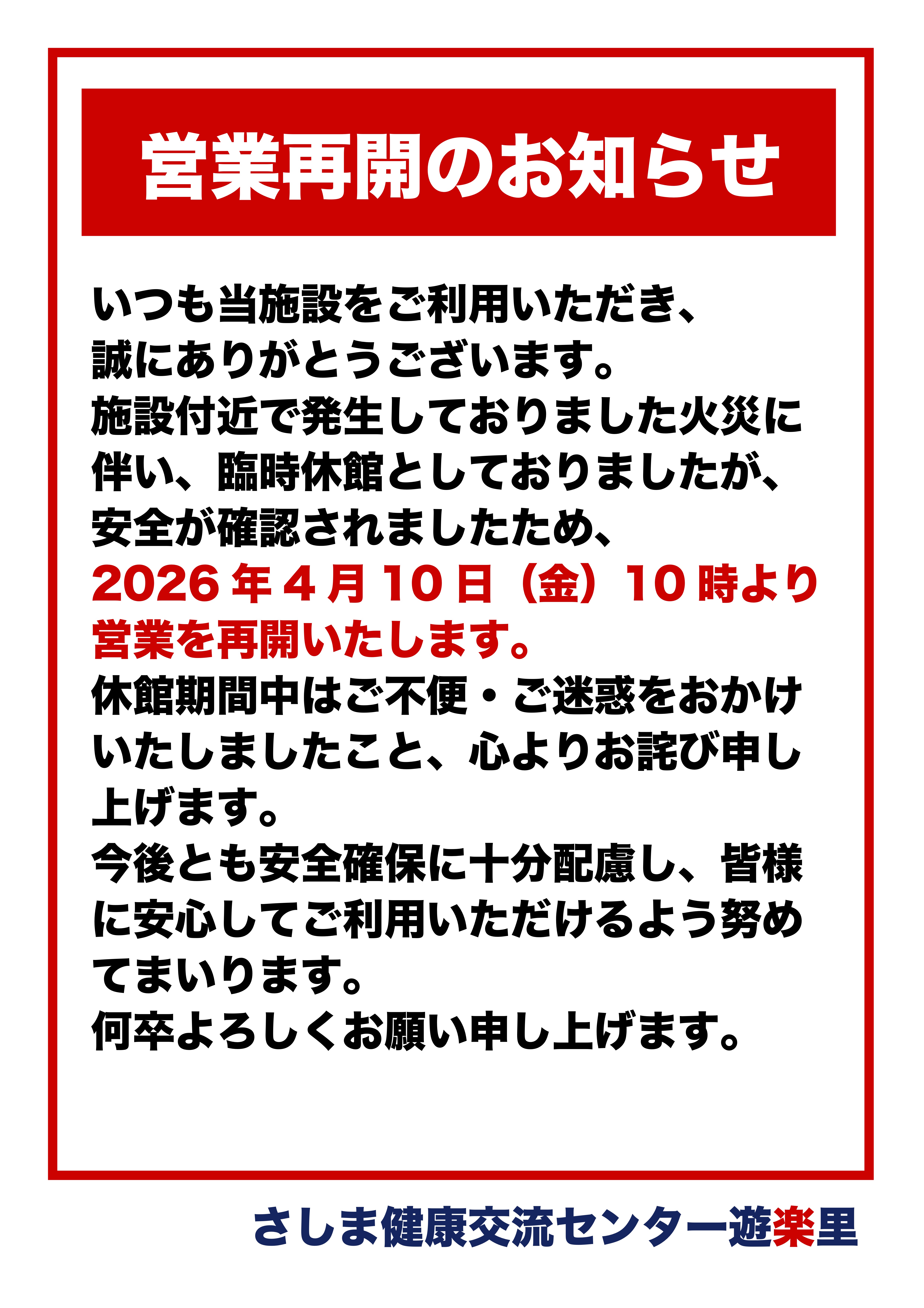 いつも当施設をご利用いただき、誠にありがとうございます。 施設付近で発生しておりました火災に伴い、臨時休館としておりましたが、安全が確認されましたため、2026年4月10日(金)10時より営業を再開いたします。 休館期間中はご不便・ご迷惑をおかけいたしましたこと、心よりお詫び申し上げます。 今後とも安全確保に十分配慮し、皆様に安心してご利用いただけるよう努めてまいります。 何卒よろしくお願い申し上げます。