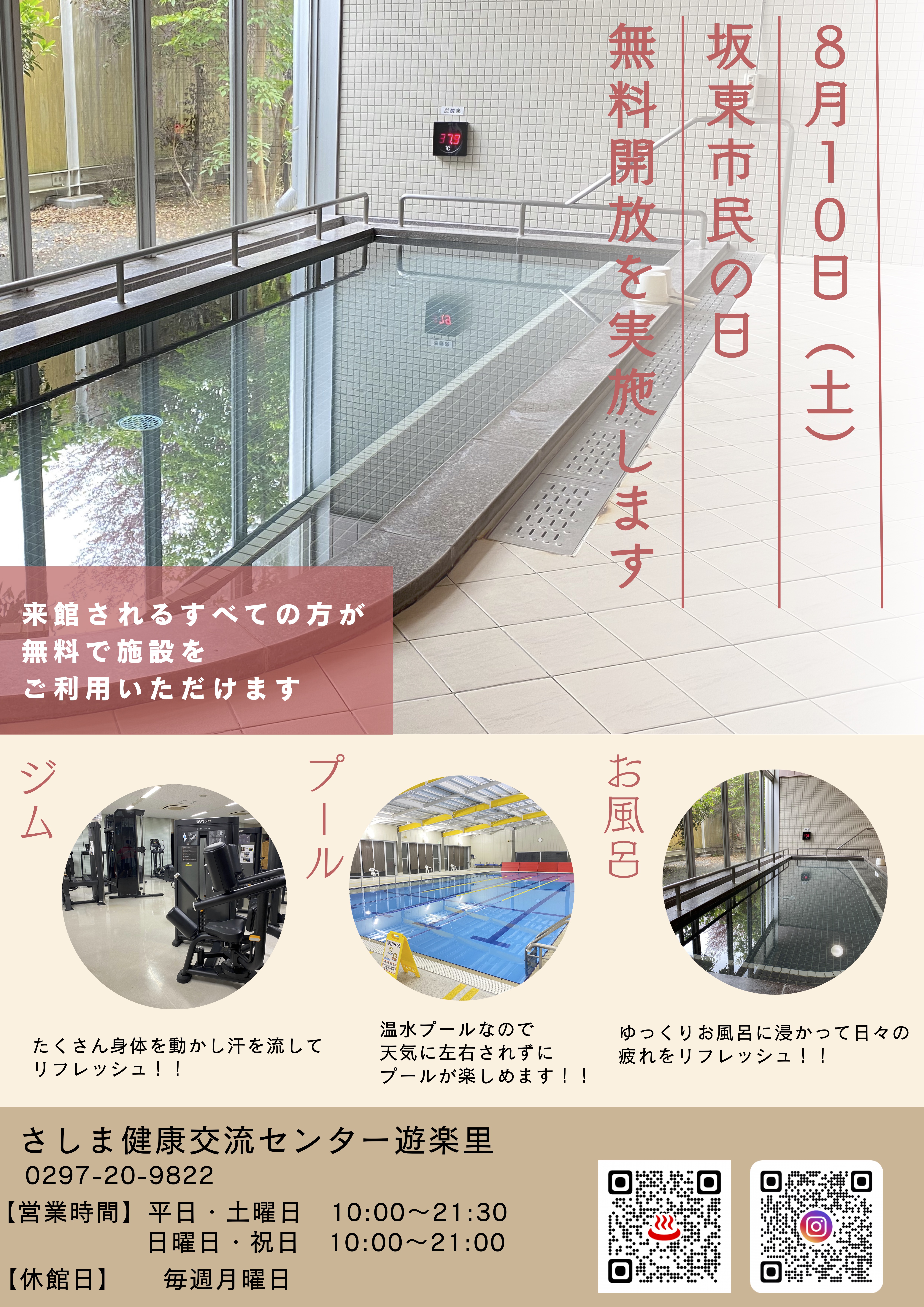 8月10日(土)は『坂東市民の日』として、来場されるすべてのお客様が無料で施設をご利用いただけます。 浴室・プール・トレーニングジムが無料でご利用いただけます。 なお、トレーニングジムは講習修了証のご提示が必要となります。 来館の際は、券売機で無料券を発券し、フロントでロッカーキーをお受け取りください。 皆さまのご来館、スタッフ一同心よりお待ちしております。