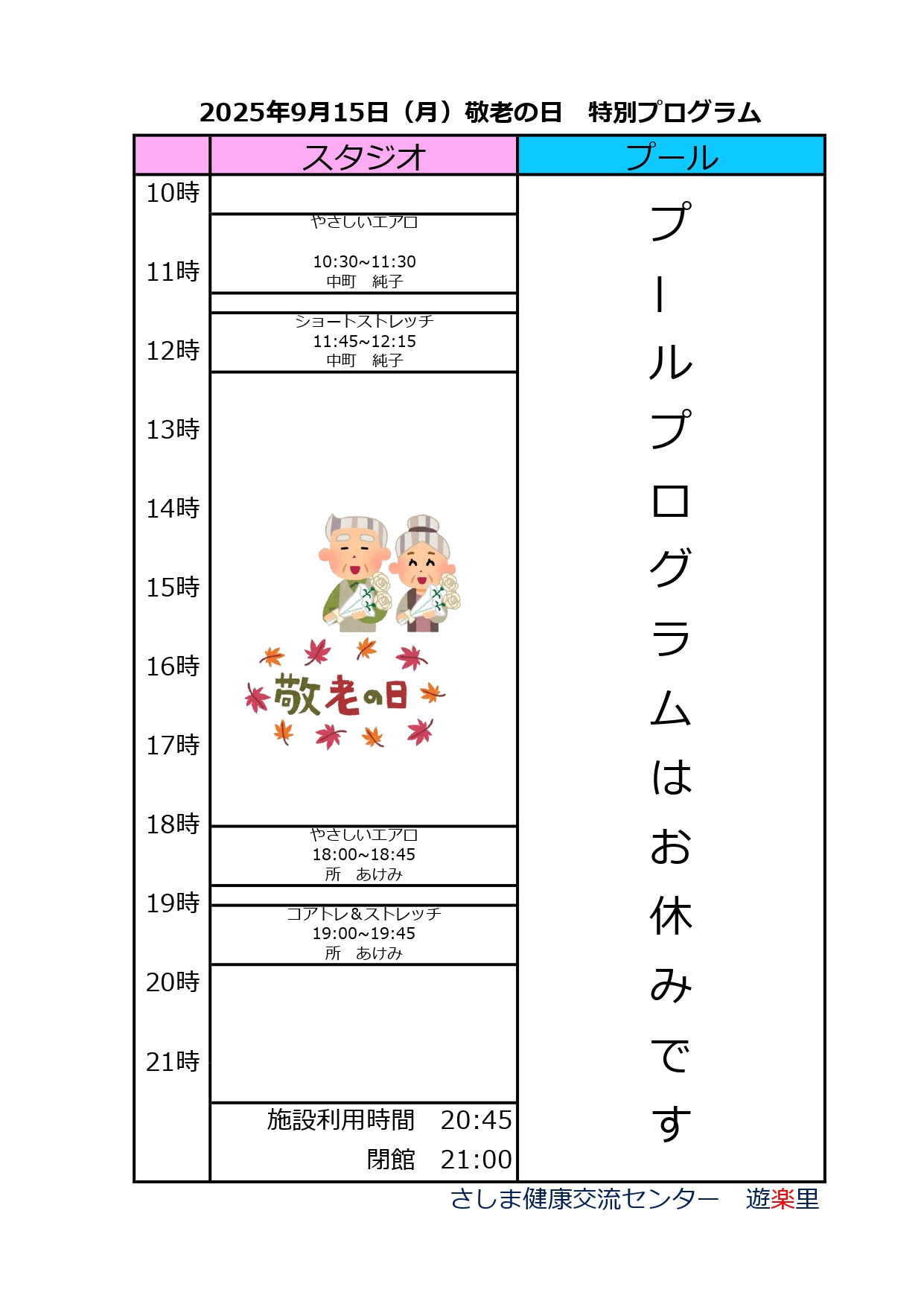 さしま健康交流センター遊楽里です。 2025年9月15日(月)敬老の日の特別プログラムとなります。 変更になっているプログラムがございますので、ご確認のうえご参加ください。