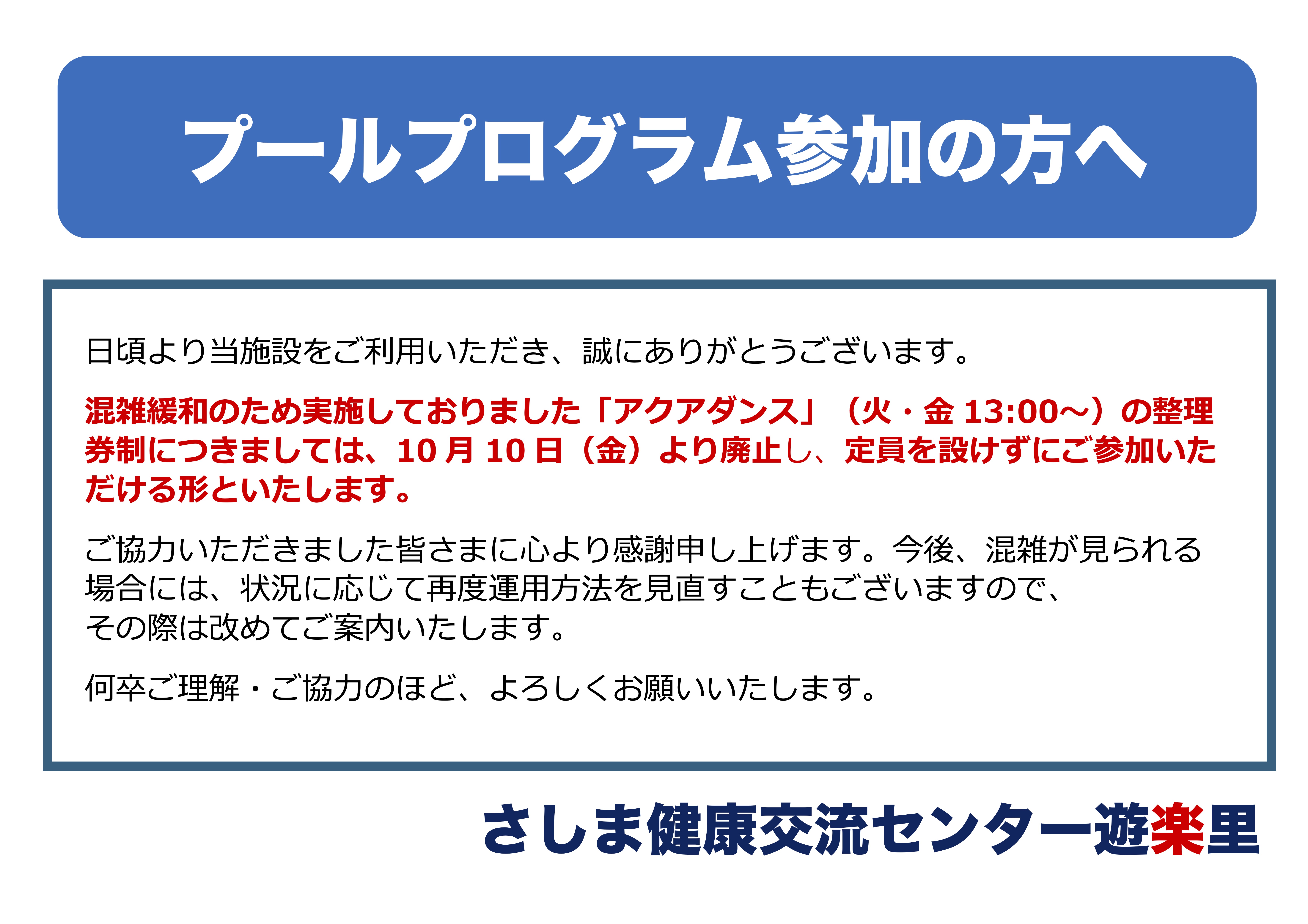 混雑緩和のため実施しておりました「アクアダンス」(火・金13:00~)の整理券制につきましては、10月10日(金)より廃止し、定員を設けずにご参加いただける形といたします。