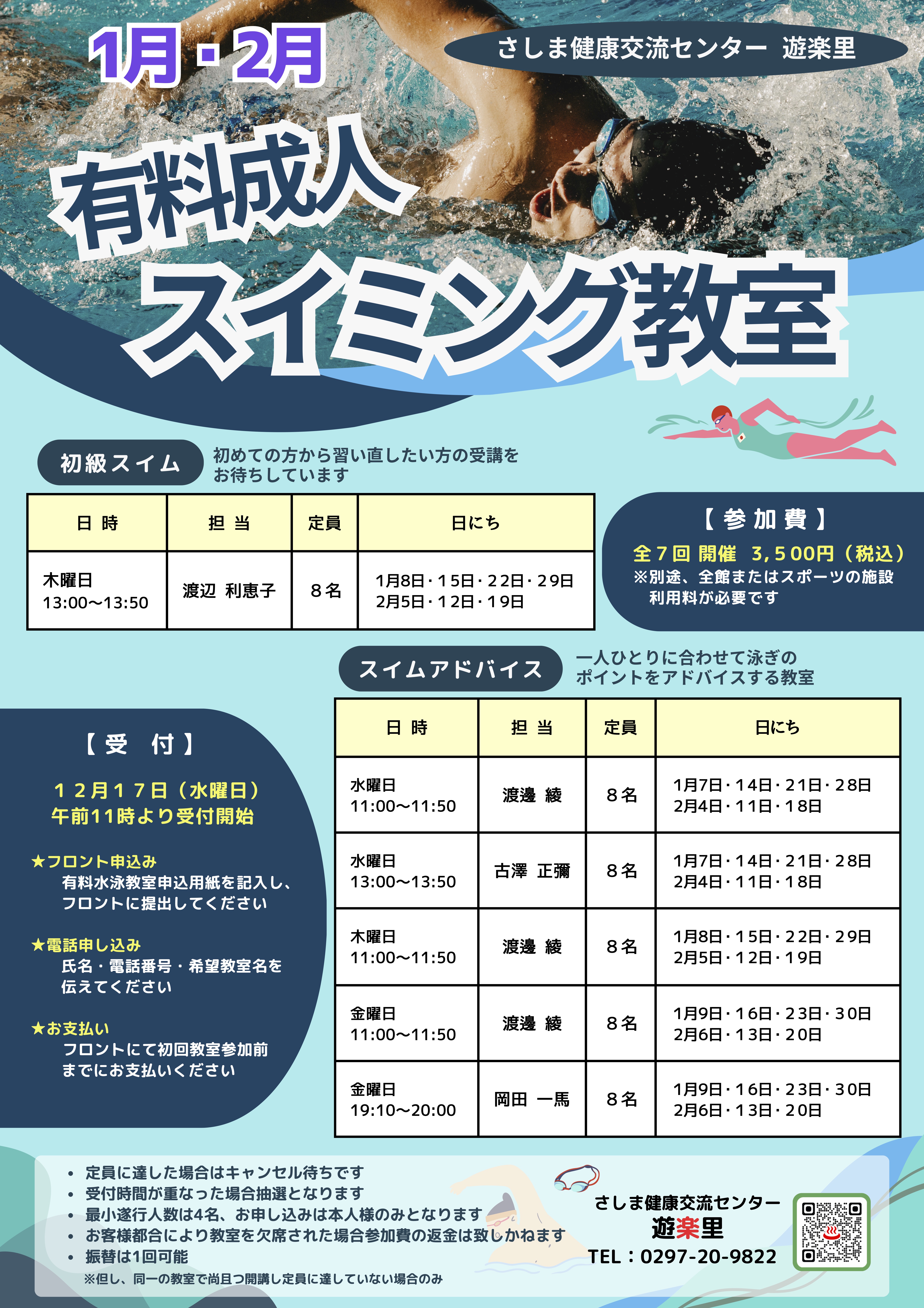 みなさんこんにちは! さしま健康交流センター遊楽里です! 1月・2月有料成人スイミング教室のスケジュールが決まりましたのでご案内させていただきます! 12月17日(水)11:00より受付開始となります! 事前にプール掲示板・フロントにて申し込み用紙をお配りさせていただいておりますのでそちらにご記入いただき、受付時にフロントにご提出ください。 皆様のご参加を心よりお待ちしております!