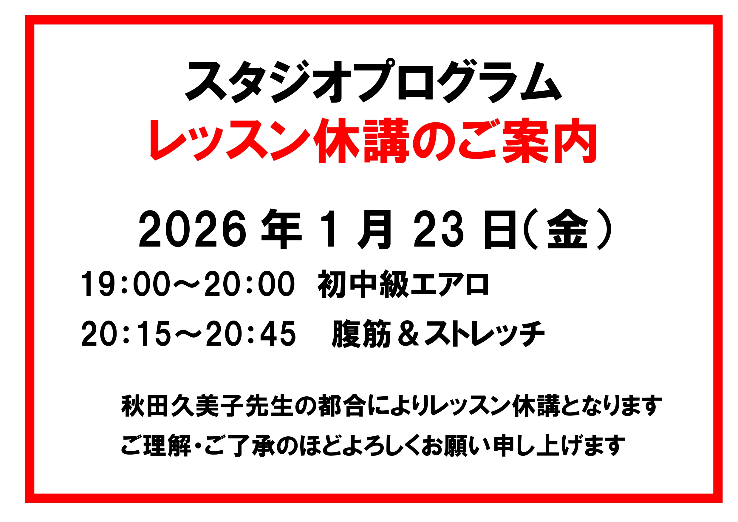 いつも当施設をご利用いただき、誠にありがとうございます。 1月23日(金)に開講予定でした下記のスタジオプログラムは講師の都合により 休講となります。 19:00~20:00 初中級エアロ 20:15~20:45 腹筋&ストレッチ 秋田 久美子 急な変更となり申し訳ございません。 ご理解のほどをお願い申し上げます。
