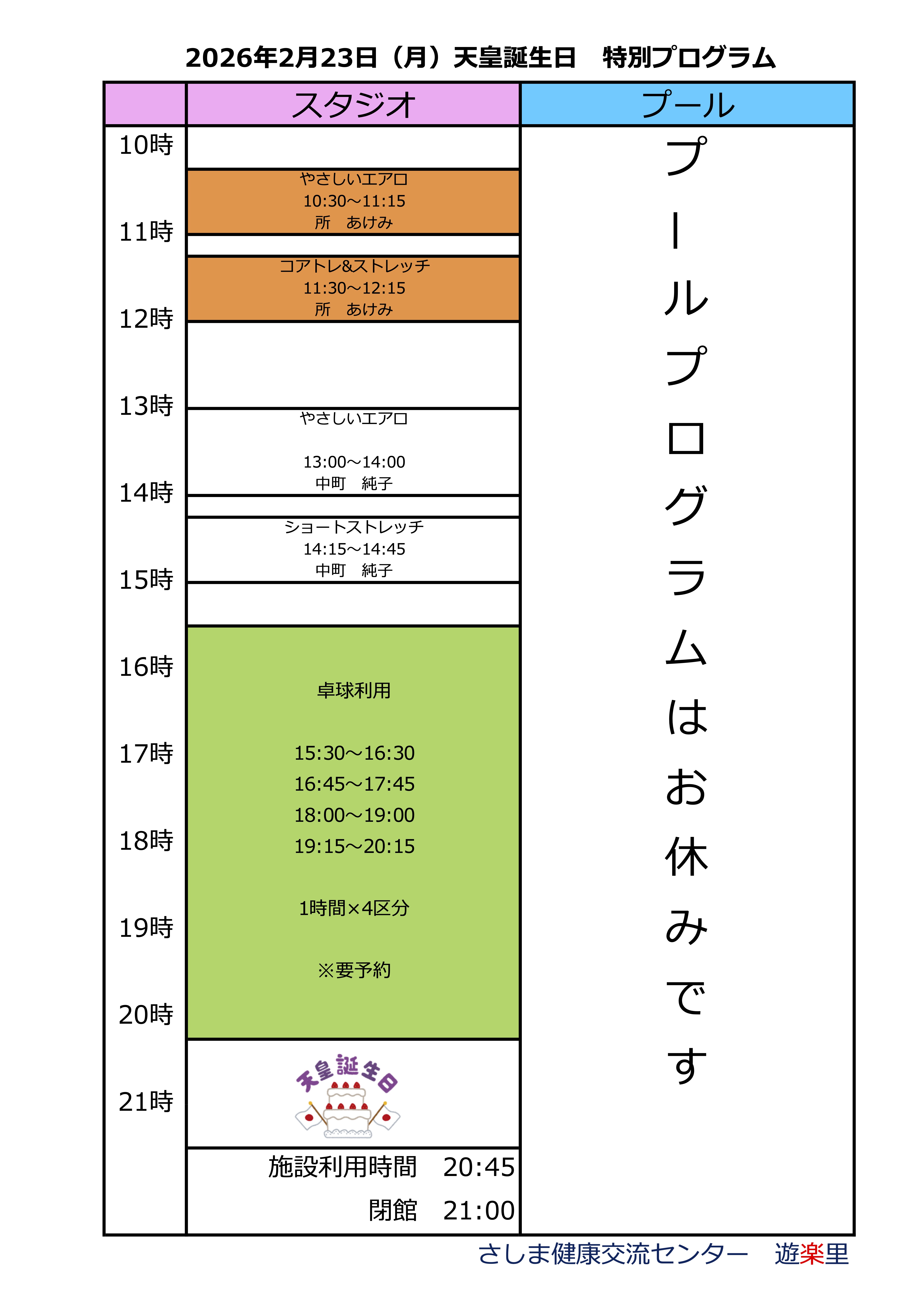 2026年2月23日(月)天皇誕生日の特別プログラムとなります。 変更になっているプログラムがございますので、ご確認のうえご参加ください。