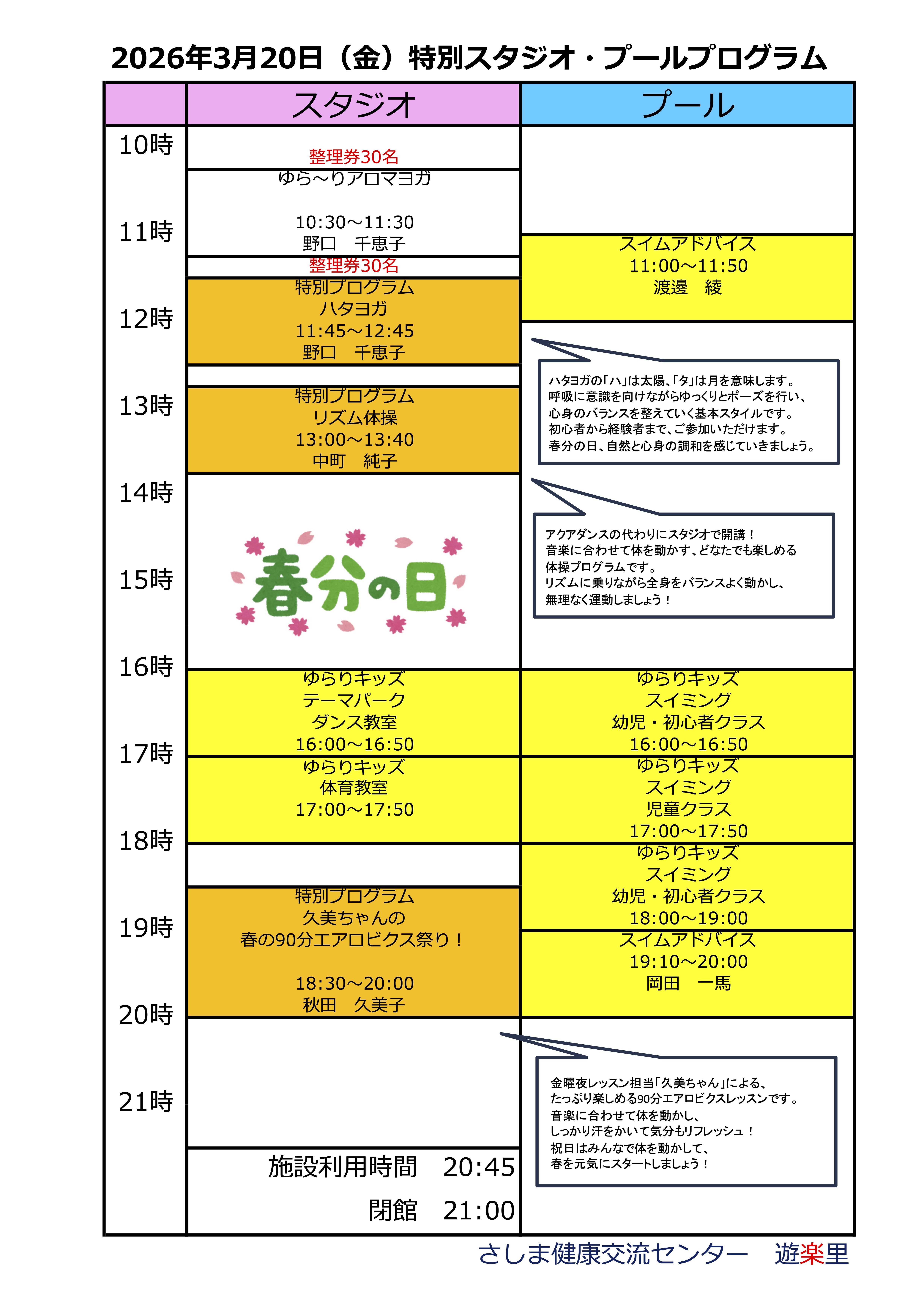 2026年3月20日(金・祝) 春分の日 特別プログラムとなります。 変更になっているプログラムがございますので、ご確認のうえご参加ください。
