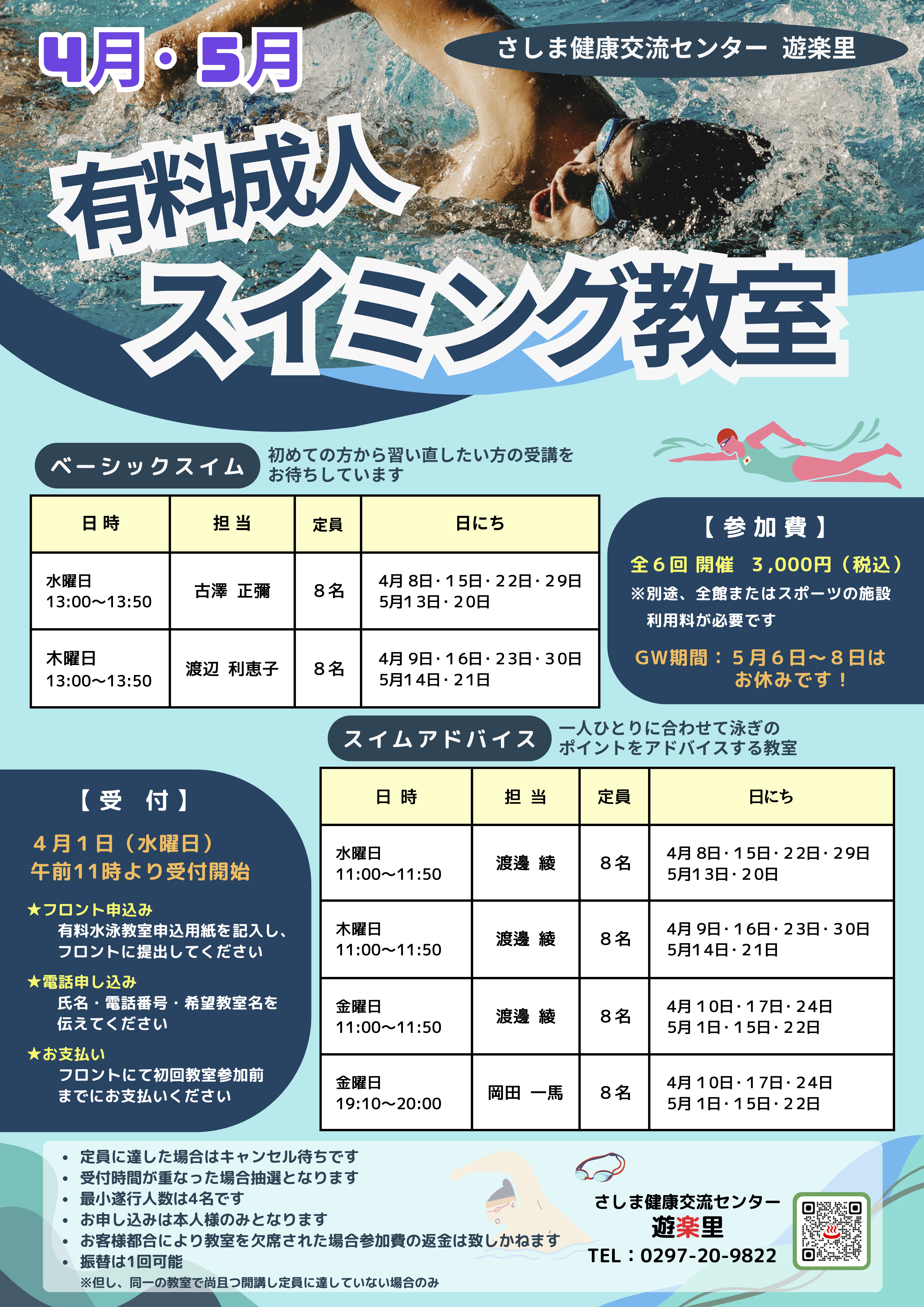 みなさんこんにちは! さしま健康交流センター遊楽里です! 4月・5月有料成人スイミング教室のスケジュールが決まりましたのでご案内させていただきます! 4月1日(水)11:00より受付開始となります! 事前にプール掲示板・フロントにて申し込み用紙をお配りさせていただいておりますのでそちらにご記入いただき、受付時にフロントにご提出ください。 皆様のご参加を心よりお待ちしております!