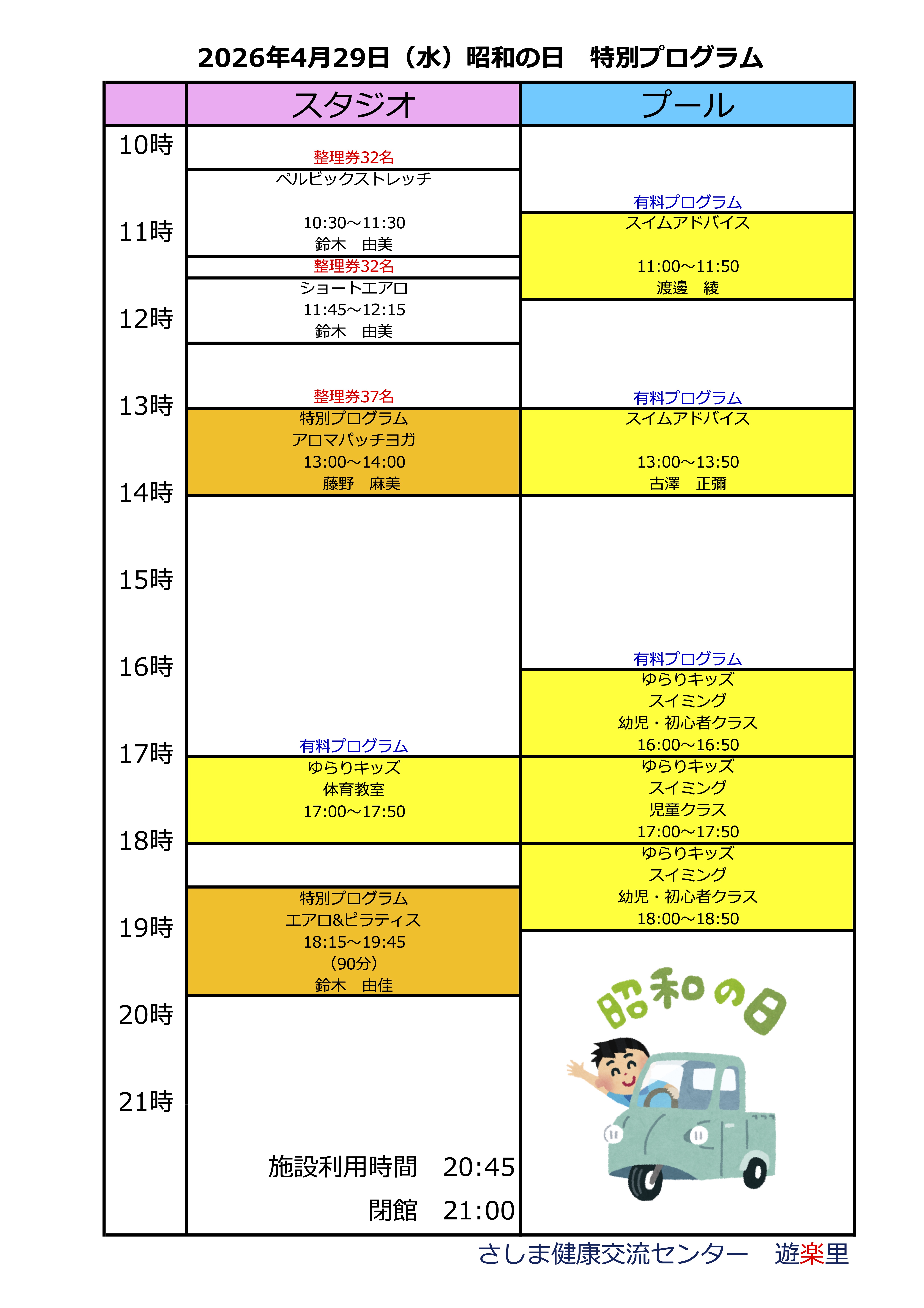 2026年4月29日(水・祝) 昭和の日 特別プログラムとなります。 変更になっているプログラムがございますので、ご確認のうえご参加ください。